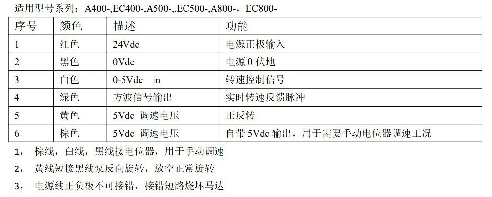 1、外部給轉速控制線(白色),0-5VDC 信號,可以實現(xiàn)流量,壓力 0-Max 的變化。可以配合壓力傳感器,電位器,PLC,工控板。。。。動態(tài),靜態(tài),連續(xù),間斷等方式來輸送液體,或產生壓力。